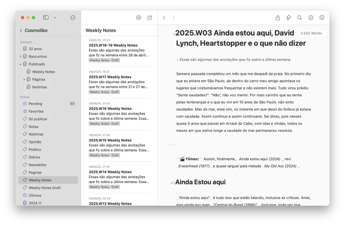 Essas edições incluíam filmes que assisti, artigos que li, músicas que ouvi, fotografias das quais me orgulhei, links com os quais me diverti. Mas, principalmente, esboços com reflexões de cada período. E foram esses textos que me impediram de publicar os rascunhos. Eu queria garantir ter finalizado uma história pessoal antes de começar a contar outra. Mas o tempo de viver as histórias é muito mais agitado e longo que o tempo disponível sozinho para processá-las. Mesmo sabendo disso, insisti e acumulei esses pedaços incompletos do meu 2025.