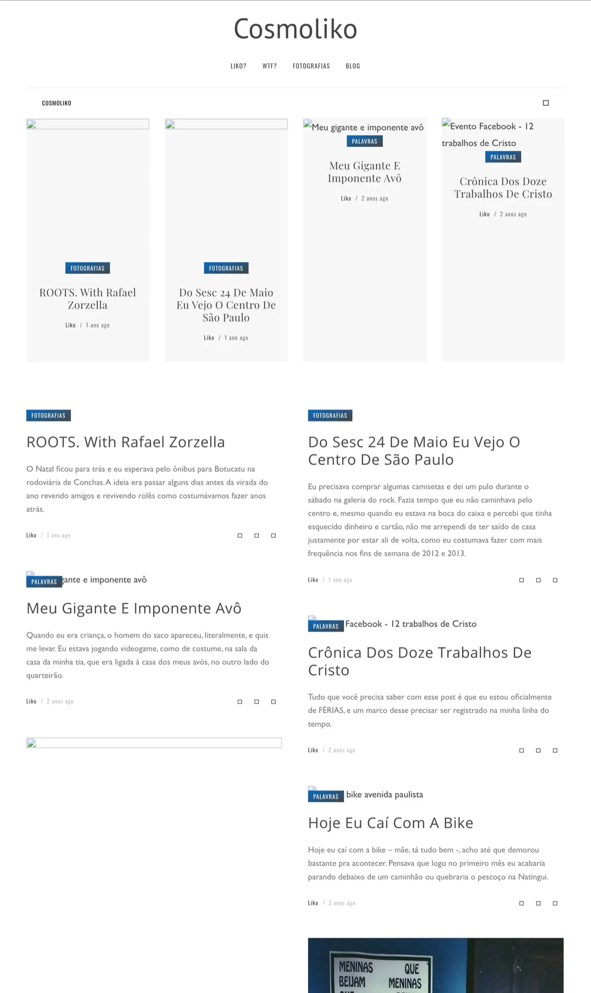O Cosmoliko é um recorte, um fragmento do meu universo que eu posso explorar e deixar acessível. É daí também que surge o nome. Da junção das palavras Cosmos e Liko. Cosmos, de universo, e Liko, por ser o meu apelido mais antigo e que usava de user desde que comecei a utilizar internet. (Naquela época eu ainda não era conhecido como Jesus - meu cabelo estava chegando no ombro.)