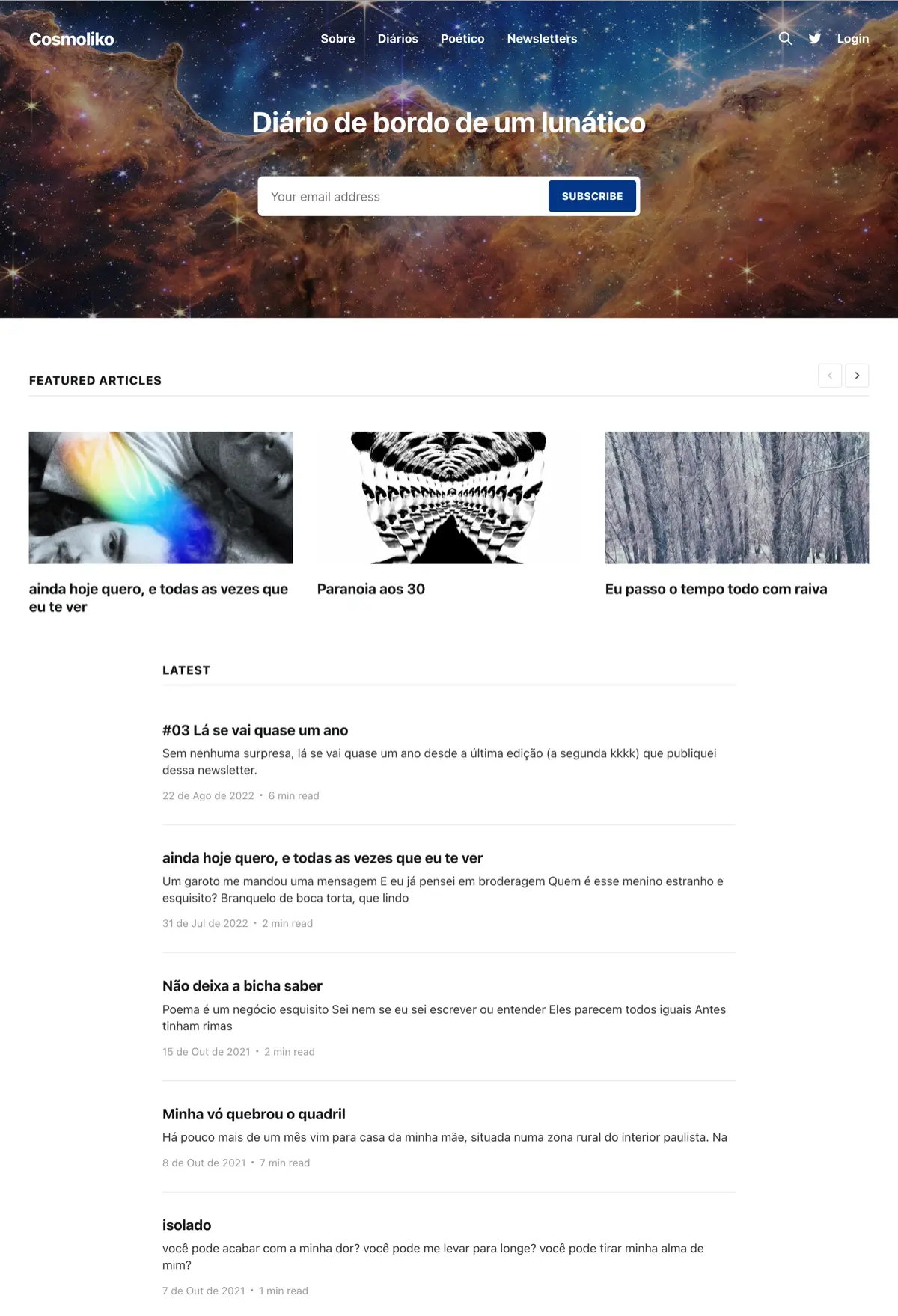 Queria também que essa plataforma facilitasse a mistura de blog, newsletter e zines — um lugar onde eu possa construir uma audiência num ritmo lento e independente da lógica das redes e, quem sabe no futuro, trabalhar com projetos de escrita de forma mais séria.