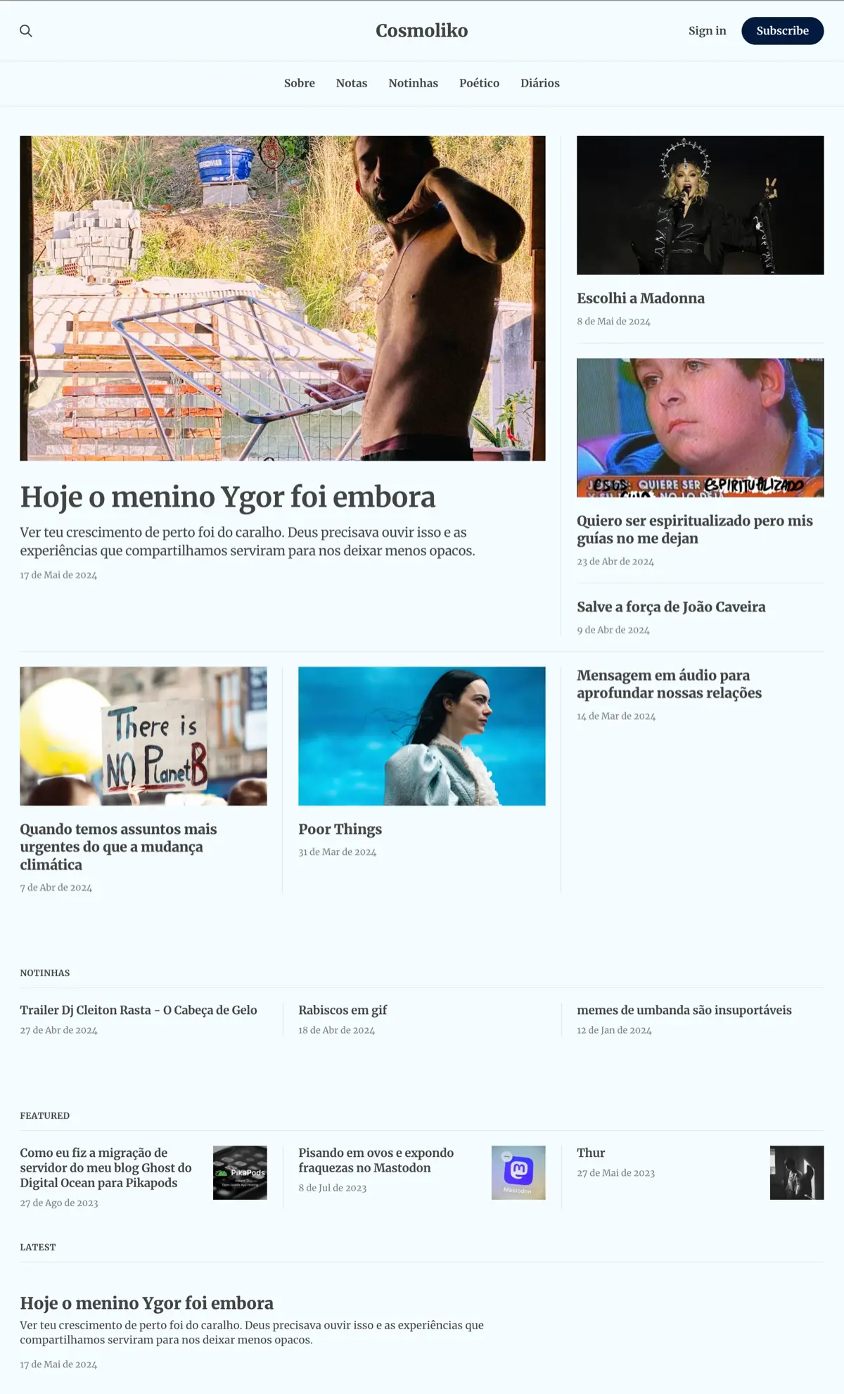 O Ghost era uma promessa de menos fricção para pessoas que só queriam escrever e publicar. E era isso que eu precisava. Infelizmente, tive que abrir mão da fotografia, o Ghost é péssimo para isso.